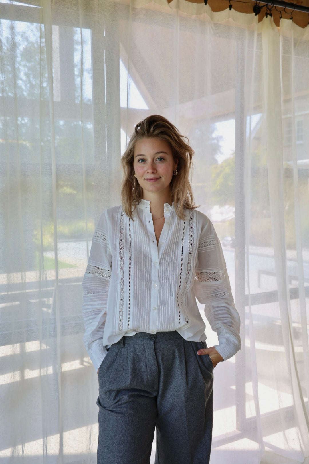 Blouse CHRIS is gemaakt van ecru katoenvoile. De ronde halslijn wordt geaccentueerd door een klein kraagje met ruches, wat een vrouwelijke, romantische touch toevoegt.