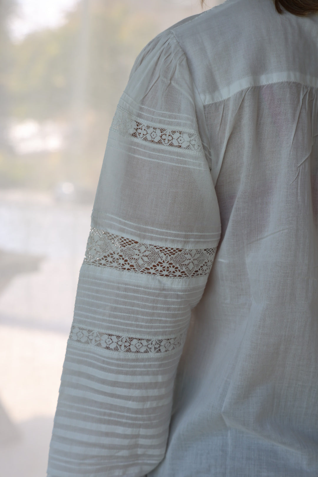 Opengewerkte kant, fijne plooien en plooien op de schouders en rug geven reliëf aan het silhouet. Gesmokte manchetten maken het item af met een subtiele afwerking.