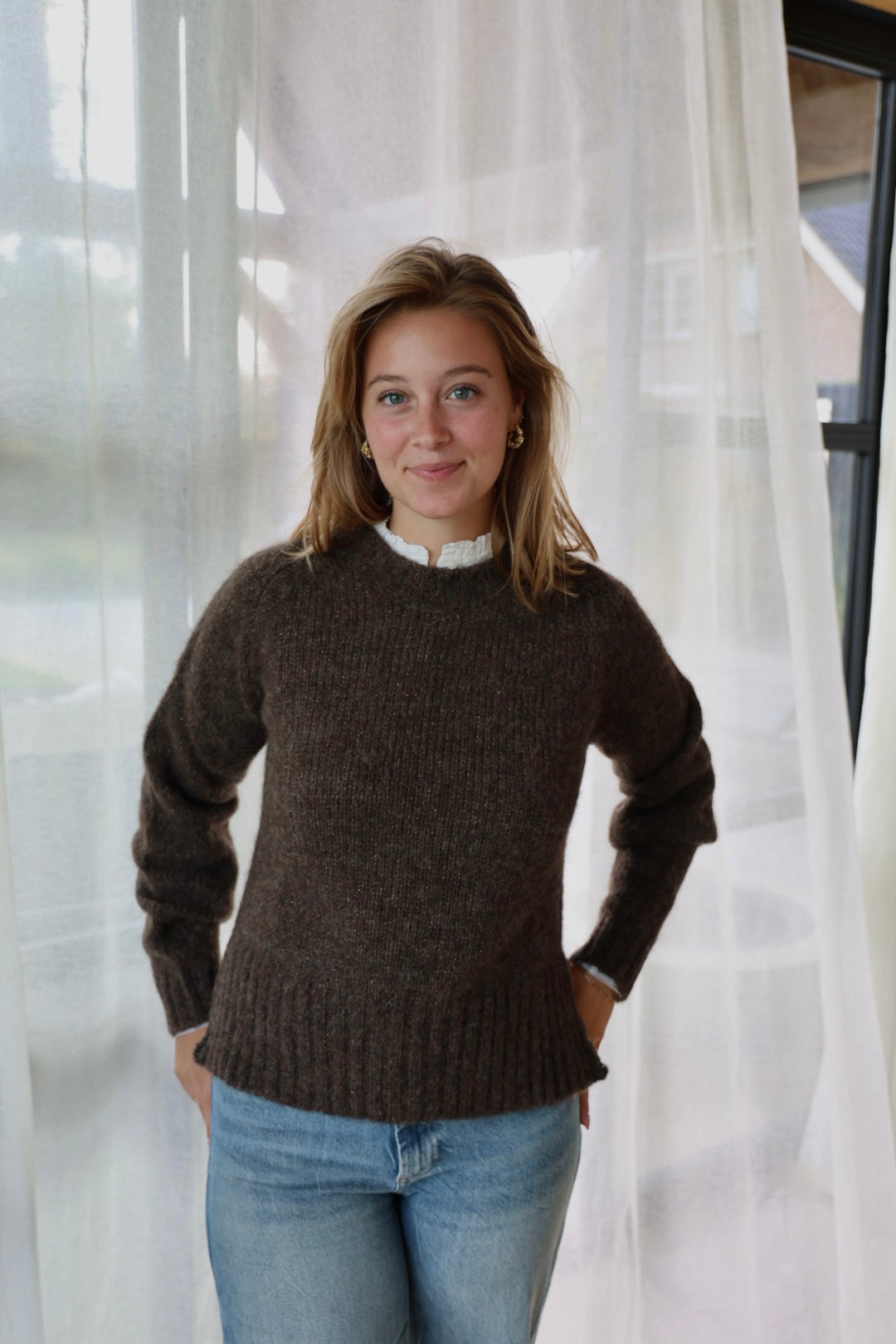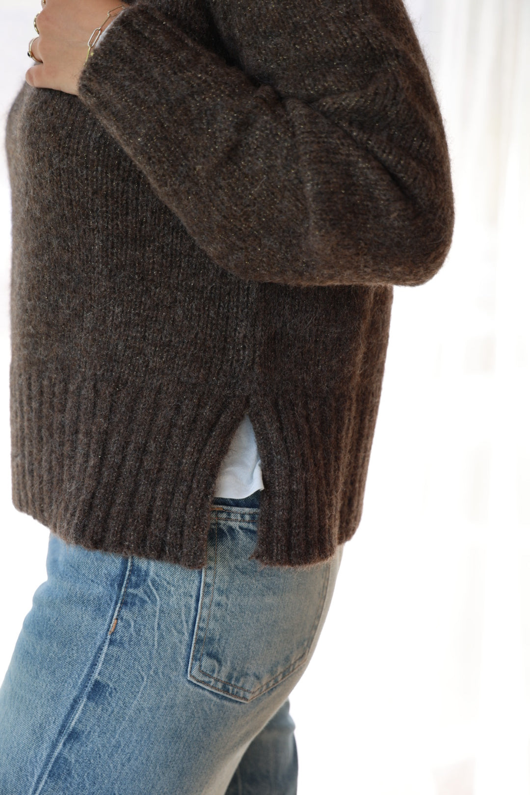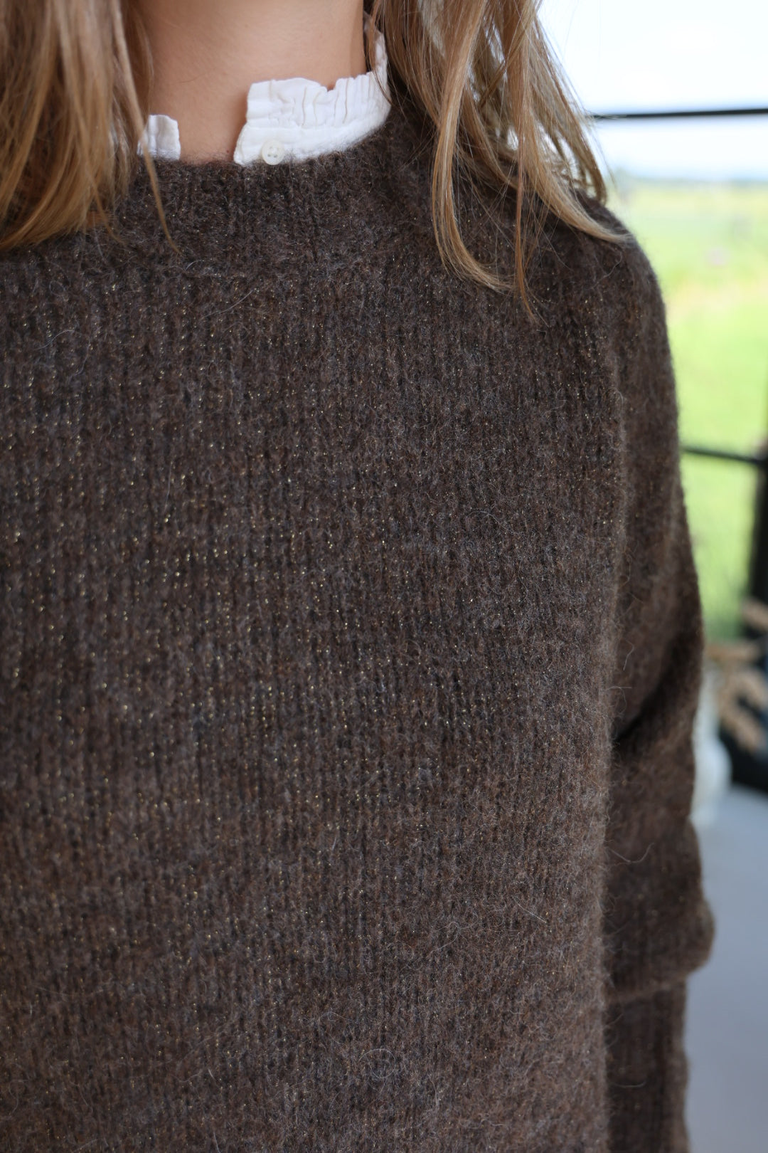De goudkleurige lurex in het zachte breisel glanst subtiel, terwijl de rib boorden zorgen voor een sportief detail. In de zoom zit een sportieve split. Uitgevoerd in de modekleur bruin is dit een veelzijdige aanvulling.