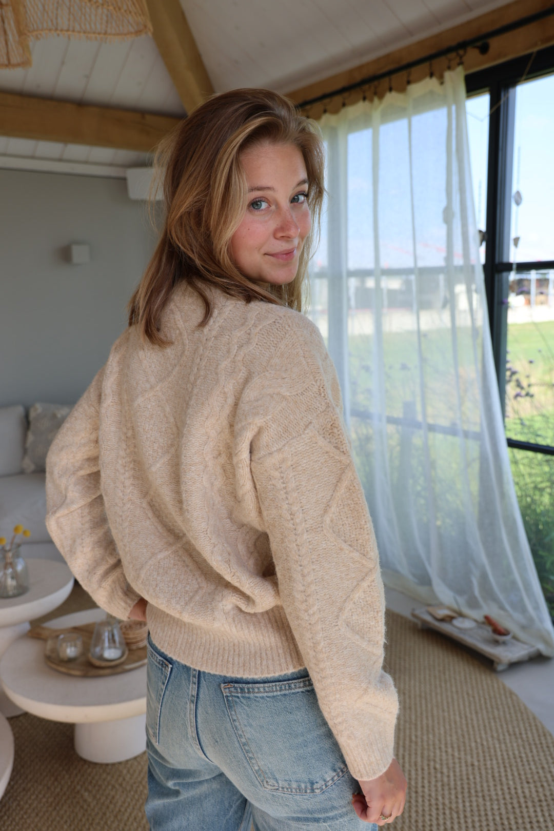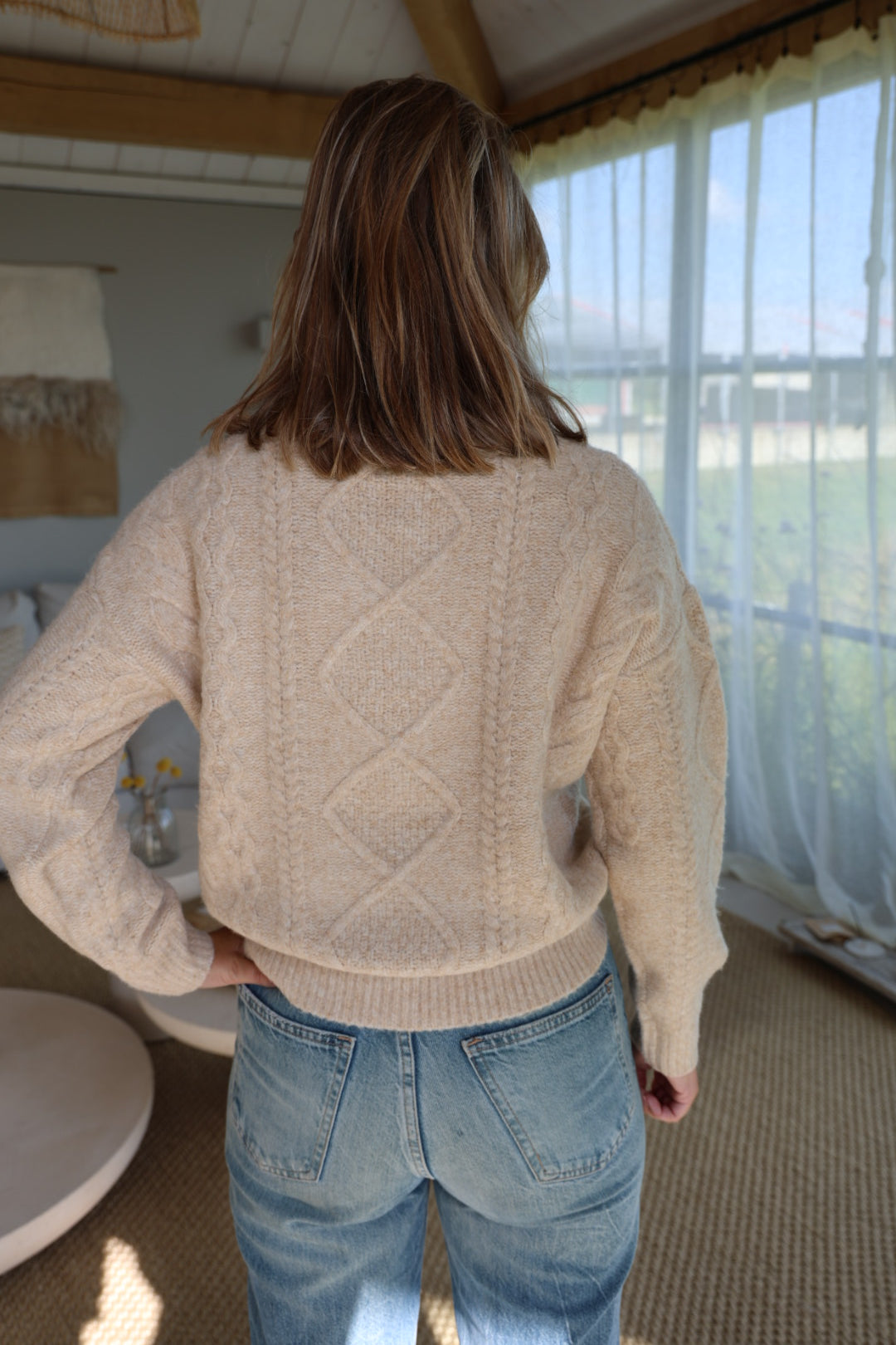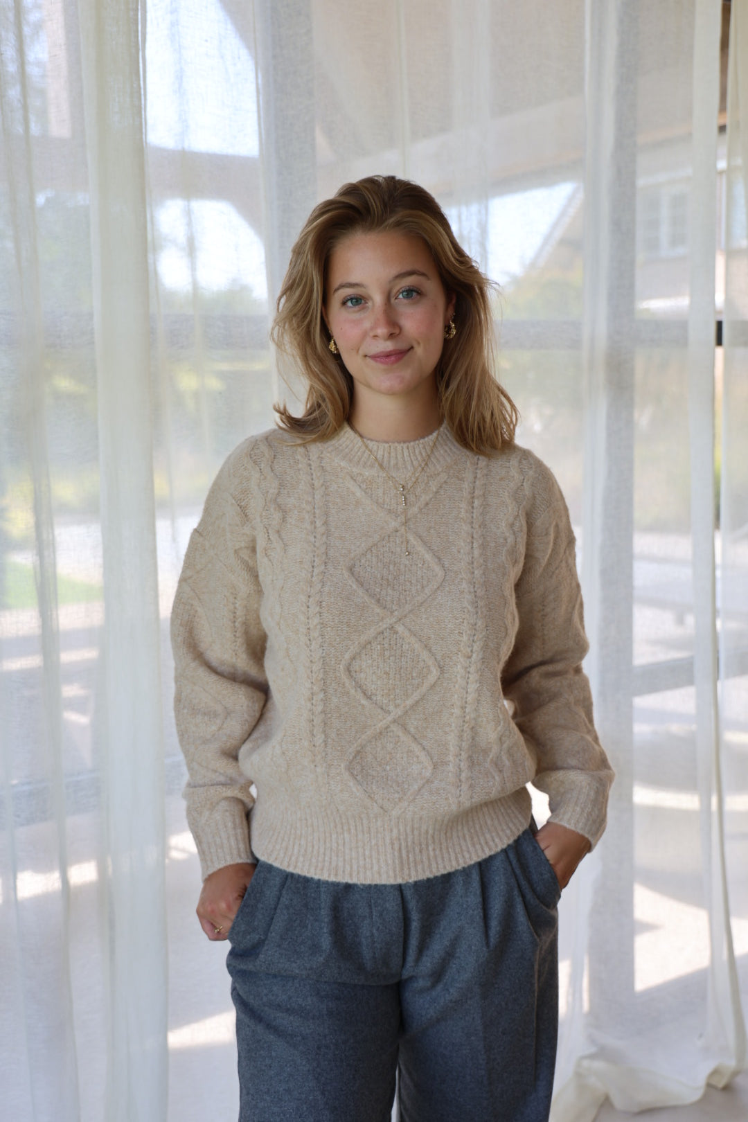 De MALOYA-trui, gemaakt van zacht, pluizig garen, de klassieke kabeltrui met een uitgesproken moderne uitstraling. De ruime pasvorm en verlaagde armsgaten geven de trui een casual, vrouwelijke look. De gemêleerde ecru kleur voegt een vleugje natuurlijke elegantie toe die gemakkelijk te combineren is. Draag met een casual jeans, een wollen broek of een soepele rok.